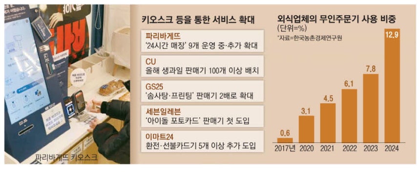 프랜차이즈·편의점 등에서 인건비 부담 등을 감안해 키오스크 등 자동화 기기를 활용해 서비스를 개편·확대하는 움직임이 더욱 늘어나고 있다. 파리바게뜨는 키오스크 등을 .. |